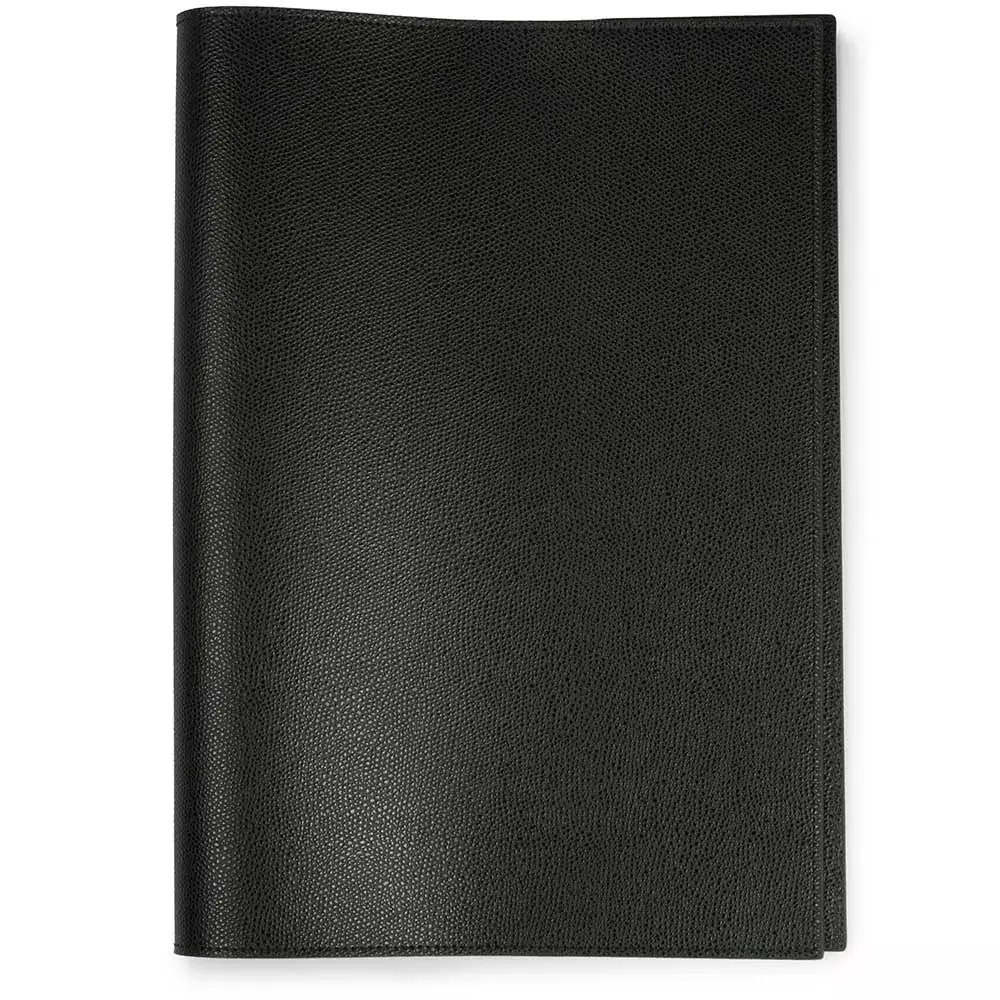 Ob unterwegs auf Reisen, auf dem Schreibtisch oder Zuhause – umhüllt mit einem Einband aus Leder wirken Notizbuch und Kalender stets elegant. Dieser Buchumschlag im A4-Format ist Schutzhülle und Designobjekt in einem. Das pflanzlich gegerbte Rindsleder besitzt eine geprägte Oberfläche, schmiegt sich perfekt an Ihr Notizbuch oder Ihren Kalender an und schützt somit optimal vor äußeren Einflüssen und Knicken. Das Leder schimmert leicht und ist besonders fest und robust. Als nachhaltige Alternative zum festgebundenen Leder-Notizbuch lässt sich das Innenleben beliebig oft austauschen und die Buchhülle entwickelt im Laufe der Jahre eine charaktervolle Patina. Die schlichte Optik wird durch schwarzes Glattleder im Innenbereich sowie eine umlaufende, Ton in Ton gehaltene Ziernaht abgerundet. Format: 22,0 x 31,0 cm.