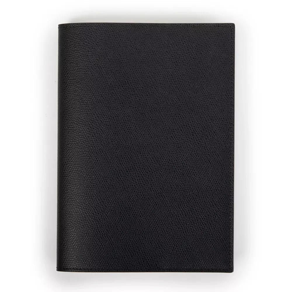 Ob unterwegs auf Reisen, auf dem Schreibtisch oder Zuhause – umhüllt mit einem Einband aus Leder wirken Notizbuch und Kalender stets elegant. Dieser Buchumschlag im A5-Format ist Schutzhülle und Designobjekt in einem. Das pflanzlich gegerbte Rindsleder besitzt eine geprägte Oberfläche, schmiegt sich perfekt an Ihr Notizbuch oder Ihren Kalender an und schützt somit optimal vor äußeren Einflüssen und Knicken. Das Leder schimmert leicht und ist besonders fest und robust. Als nachhaltige Alternative zum festgebundenen Leder-Notizbuch lässt sich das Innenleben beliebig oft austauschen und die Buchhülle entwickelt im Laufe der Jahre eine charaktervolle Patina. Die schlichte Optik wird durch schwarzes Glattleder im Innenbereich sowie eine umlaufende, Ton in Ton gehaltene Ziernaht abgerundet. Format: 16,0 x 22,0 cm.