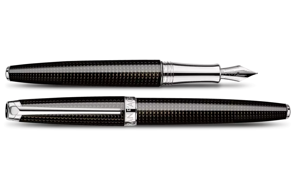 Die Jubiläumsedition De Nuit zum 20. Jubiläum der Kult-Kollektion ist so magisch wie die Nacht und so festlich wie die funkelnden Farben eines Feuerwerks. Der runde Messing-Schaft ist mit einem feinen, guillochierten Motiv names „Clous de Paris“ versehen und mit einem schwarz glänzenden, durchscheinenden und glatt polierten Lack überzogen. Diese Veredelung ist ein Beispiel für die besondere Raffinesse und Feinarbeit, die die Handwerker des Maison Caran d'Ache meisterhaft beherrschen. Versilberte und rhodinierte Details setzen funkelnde Akzente. Die Schreibfeder aus 18-karätigem Gold in verschiedenen Breiten garantiert ein luxuriöses und angenehm weiches Schreibgefühl.