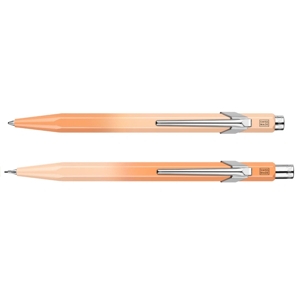 Caran d’Ache präsentiert "Sunset Sky," ein exklusives Set bestehend aus Kugelschreiber und Minenhalter 849, inspiriert von den zauberhaften Pastellfarben eines sommerlichen Sonnenuntergangs. Der sanfte Farbverlauf beginnt mit einem zarten Orange, das an die ersten Momente des Sonnenuntergangs erinnert, und intensiviert sich zu einem kräftigeren Ton, der die letzten Strahlen des Tages einfängt. Das Set spiegelt elegant den Übergang zwischen Tag und Nacht wider und besticht durch die harmonische Kombination von Design und Funktionalität. Der Kugelschreiber mit der Goliath-Nachfüllung schreibt bis zu 600 A4-Seiten, während der Minenhalter mit Radiergummi präzise Zeichnungen ermöglicht. Beide Produkte sind langlebig, nachfüllbar und zu 100 % Swiss Made. Mit ihrem robusten, sechseckigen Metallschaft bieten sie optimalen Schreibkomfort und liegen ergonomisch in der Hand. "Sunset Sky" ist die perfekte Wahl für Designliebhaber und Schreibgeräte-Enthusiasten, ob als Geschenk oder für den eigenen Gebrauch.