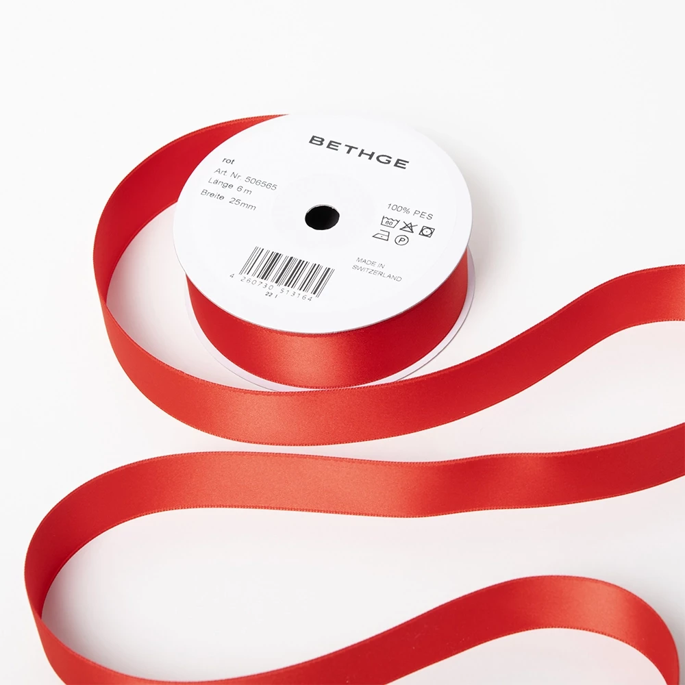In einer Seidenbandweberei in der Schweiz gefertigt, trägt jede Rolle die Präzision eines Handwerks, das sich im Detail zeigt: die saubere Webkante, der gleichmäßige Glanz des Satins, die Farbtiefe der 14 erhältlichen Töne. Das Band ist wasch-, trocken- und bügelfest, OEKO-TEX® zertifiziert und nachweislich frei von Schadstoffen. Qualität, die sich nicht nur sehen, sondern auch verantworten lässt.