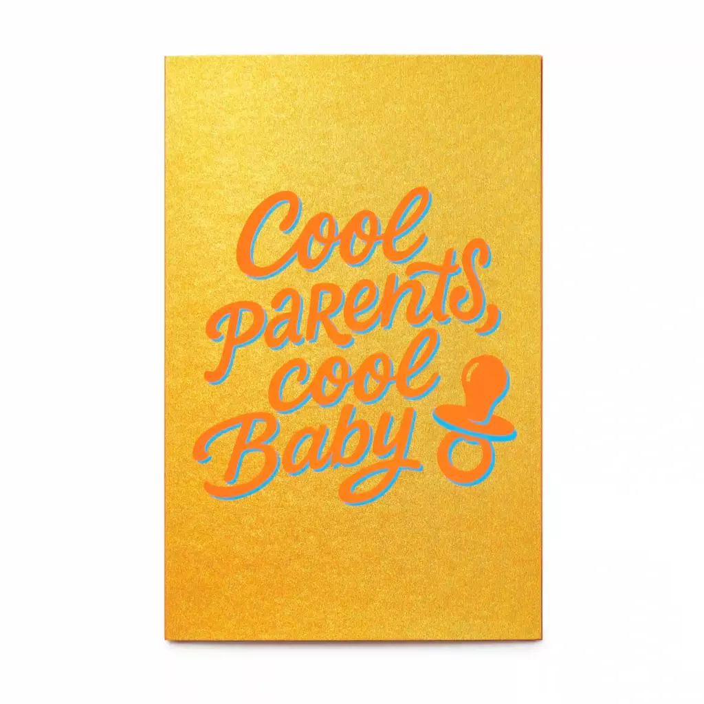 Der prägnante Schriftzug „Cool Parents, cool Baby“ und das Schnuller-Icon sind im aufwendigen Handsiebdruck auf edles Feinstpapier gedruckt – in kräftigem Orange und Blau, die auf dem goldschimmernden Karton besonders brillant wirken.