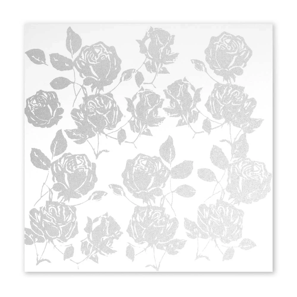 So edel - da erwacht sogar Dornröschen. Quadratisch-moderne Klappkarte im Format 15,8 x 15,8 cm mit silberfarbenen Rosen. Handbedruckt im Siebdruckverfahren. Passender Umschlag mit Seidenfutter.