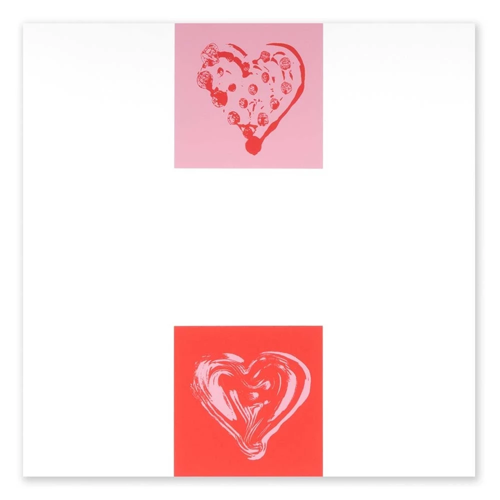 Für jeden Eins. Herzmotive in Rosa und Rot auf smooth white - von Hand bedruckt im Siebdruckverfahren. Klappkarte im modern-quadratischen Format. Mit weissem Umschlag.