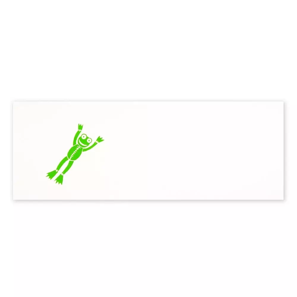 Fröhlich und munter hüpft der kleine Frosch auf dieser Karte uns entgegen. Die charmante Illustration erfreut Kinder- und Erwachsenenherzen. Karte und Motiv stammen direkt aus dem Gestaltungs- und Siebdruck-Atelier von Bethge. Hier wird in sorgsamer Handarbeit jedes Motiv einzeln gedruckt. Der grüne Frosch wird dabei auf eine längliche Klappkarte in Hellblau im Format 22,8x8,4 cm aufgetragen. Ein passendes Kuvert rundet die Grußkarte ab.