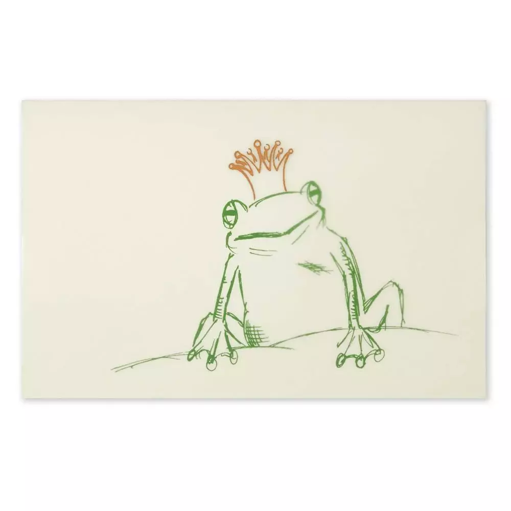 Diese raffinierte im Handsiebdruck hergestellte Grußkarte entfaltet erst in Kombination mit dem transparenten Umleger Ihre volle Wirkung. Der Umleger ist mit einer goldenen Krone, ebenfalls im aufwendigen Handsiebdruck, bedruckt und macht den Frosch auf der Karte zum Froschkönig. Das Material der Karte ist ein, je nach Lichteinfall, leicht schimmerndes Perlmutt grün mit einer Grammatur von 310 gr/m², die Druckfarbe ist Grün. Geliefert wird die Karte mit einem passenden transparenten Umschlag mit Spitzklappe im Format 12x18 cm.