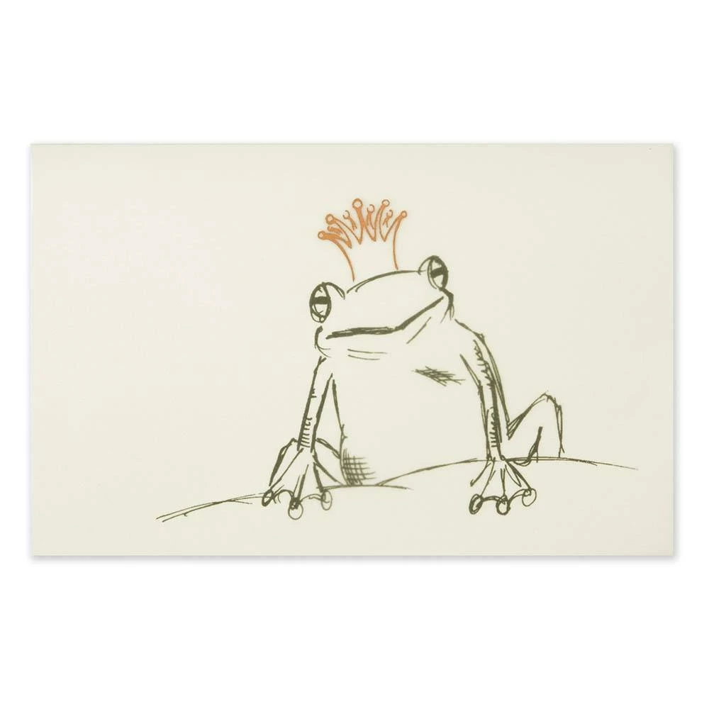 Diese raffinierte im Handsiebdruck hergestellte Grußkarte entfaltet erst in Kombination mit dem transparenten Umleger Ihre volle Wirkung. Der Umleger ist mit einer goldenen Krone, ebenfalls im aufwendigen Handsiebdruck, bedruckt und macht den Frosch auf der Karte zum Froschkönig. Das Material der Karte ist ein, je nach Lichteinfall, leicht schimmerndes Perlmutt grün mit einer Grammatur von 310 gr/m², die Druckfarbe ist Schwarz. Geliefert wird die Karte mit einem passenden transparenten Umschlag mit Spitzklappe im Format 12x18 cm.