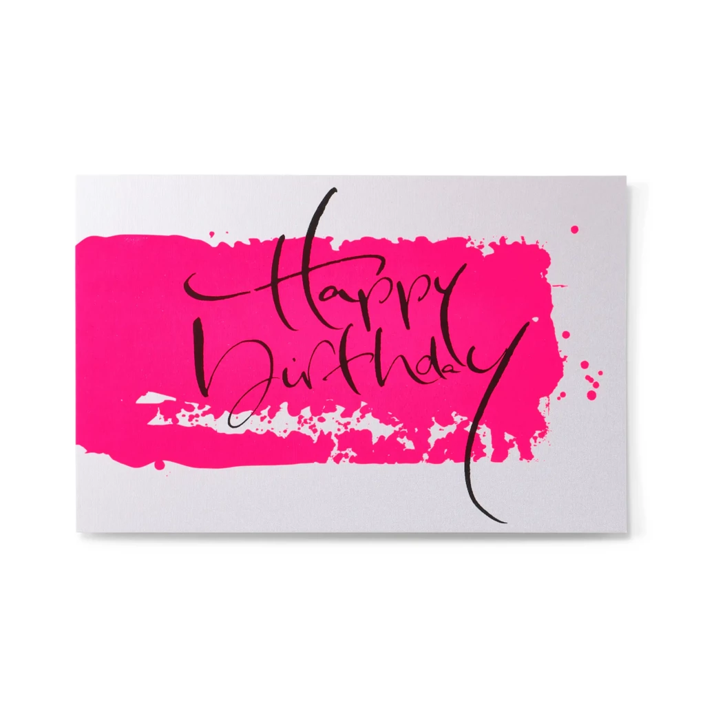 Diese Grußkarte ist eine besondere Zusammenarbeit von Bethge und der Hamburger Künstlerin Jeannine Platz. Basis ist schimmerndes Feinstpapier. In unserer Siebdruck-Manufaktur in Hamburg wird das Motiv von Hand aufgebracht. Der kalligrafische Schriftzug „Happy Birthday“ steht klar vor einem leuchtend pinken Untergrund in Pinselstrich-Optik. Für Geburtstage jeder Art, vom runden Jubiläum bis zum spontanen Anstoßen.