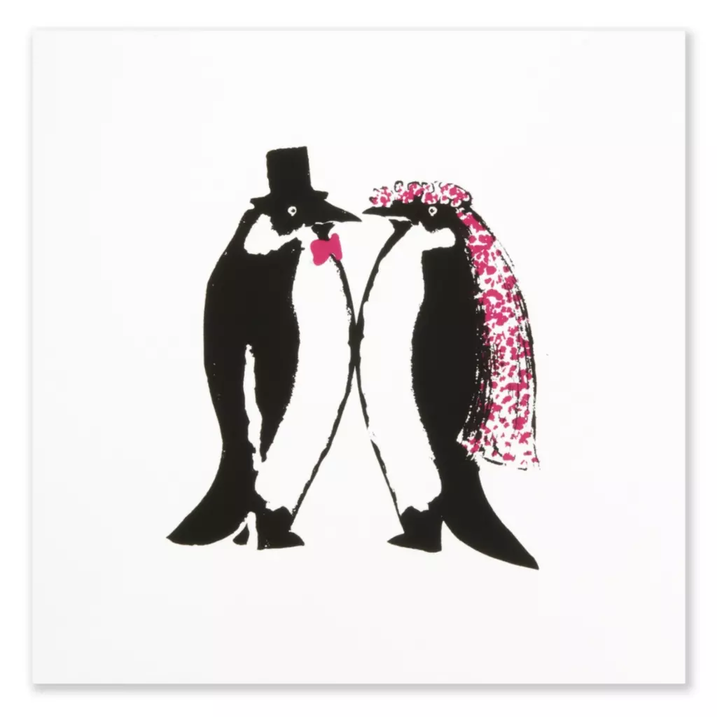 Da wirds sogar dem Pinguin warm ums Herz. Romantische Hochzeitskarte mit tierisch-süßem Motiv - eignet sich als Einladung oder zur Gratulation. Die Klappkarte hat das moderne quadratische Format 15,8x15,8 cm und wird im Siebdruck handbedruckt. Geliefert wird sie mit einem passenden Umschlag mit Seidenfutter.