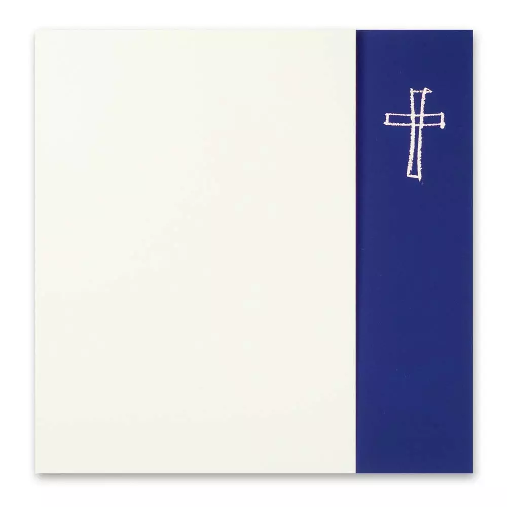 Konfirmationskarte/Kommunionskarte aus feinem Karton mit raffiniertem Ausschnitt. Von Hand gedruckte Farbfläche mit gezeichnetem Kreuz. Format 14x14 cm. Mit passendem Umschlag.
