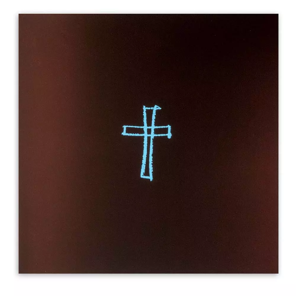 Klappkarte für Kommunion und Konfirmation aus elegantem Pure-Material. Außen tiefbraun, innen weiß. Auf dem Titel ist, von Hand, ein Kreuz in hellblau gedruckt. Format 15,8x15,8 cm. Mit passendem Umschlag.