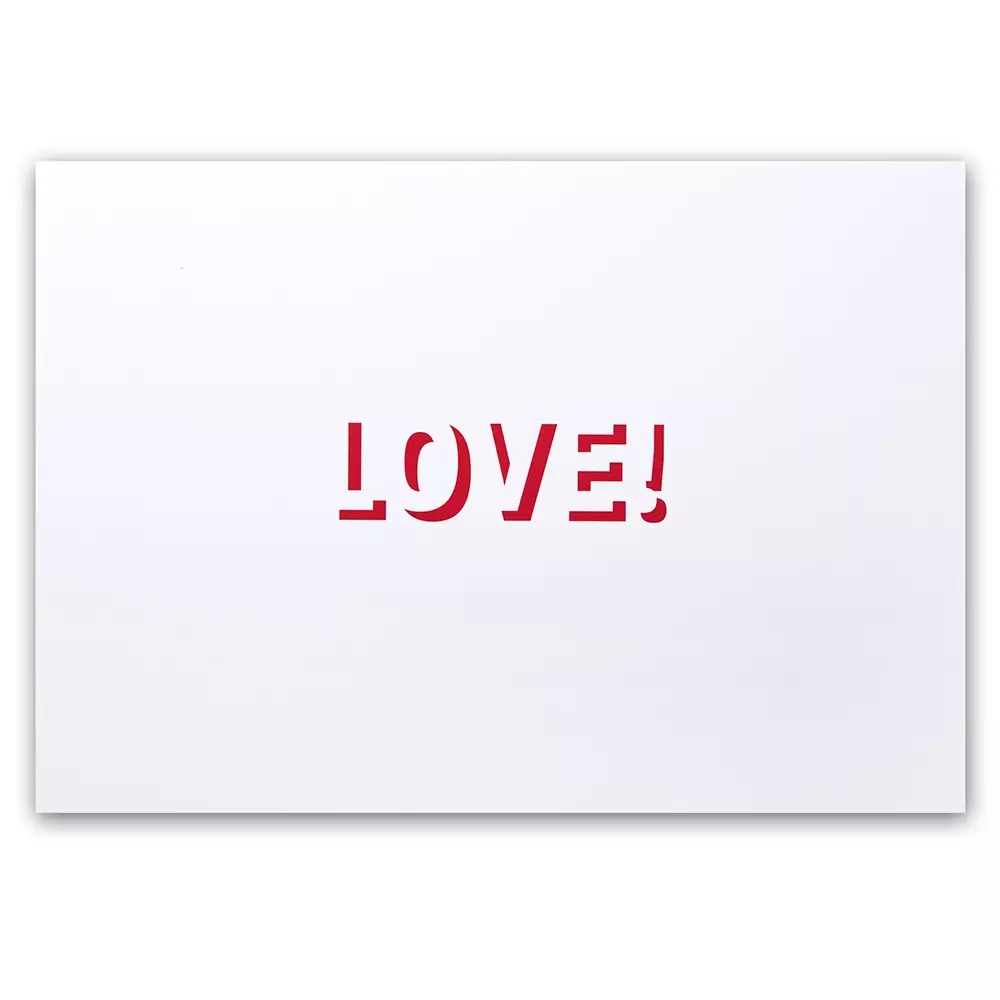 Love is the message: Diese besondere Grußkarte mit „Love!"-Schriftzug in trendigen 3D-Lettern ist der perfekte Träger für Ihre persönliche Liebesbotschaft an einen ganz besonderen Menschen. Das knallige Rot, das im Siebdruck manuell von Hand auf das edle, weiße Material gedruckt wird, hat eine hohe Leuchtkraft, welche das Statement in besonderer Art und Weise unterstreicht.