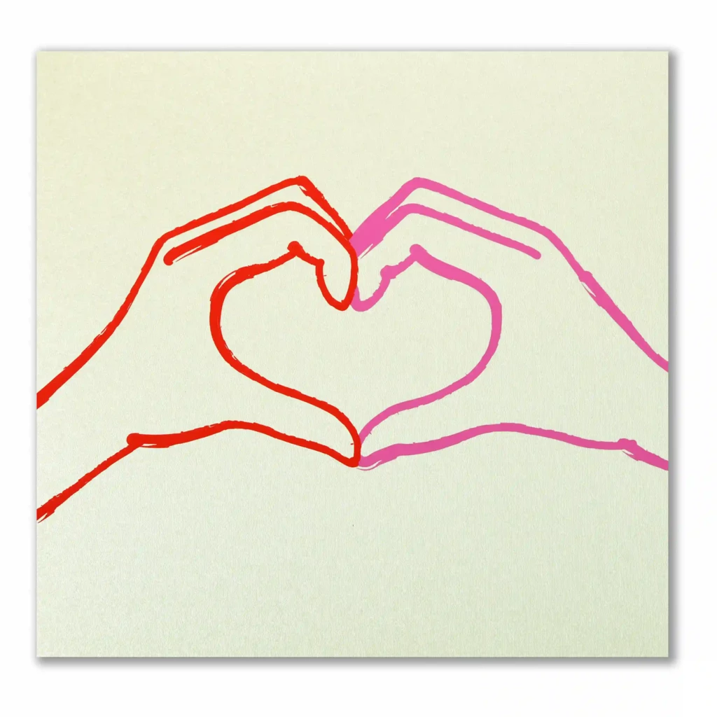 Die Grußkarte „One Heart" ist auf Perlmutt Hellgrün einseitig gefertigt, einem Feinstpapier mit 310 g/m² und glänzender Oberfläche. Das Gewicht ist spürbar. Die Karte liegt mit einer Festigkeit in der Hand, die Bestand signalisiert. Der Perlmuttschimmer des hellgrünen Papiers verleiht der Karte eine subtile Leuchtkraft, die im Licht changiert und sich von matter Papeterie klar unterscheidet. Das quadratische Format von 15,8 × 15,8 cm setzt bereits durch seine Form ein gestalterisches Zeichen.