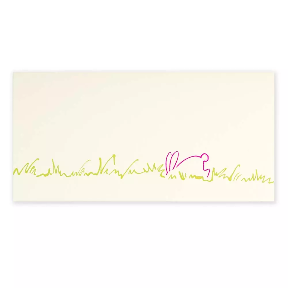 Idee und Umsetzung stammen aus dem hauseigenen Gestaltungs- und Siebdruck-Atelier von Bethge. Hier wird auch der zweifarbige Druck durchgeführt. Im hochwertigen Siebdruckverfahren wird in zwei Arbeitsdurchgängen gedruckt. Einmal das grüne Gras, einmal der neonpinkfarbene Osterhase. Ein passendes Kuvert im DIN-lang-Format liegt der Karte bei.