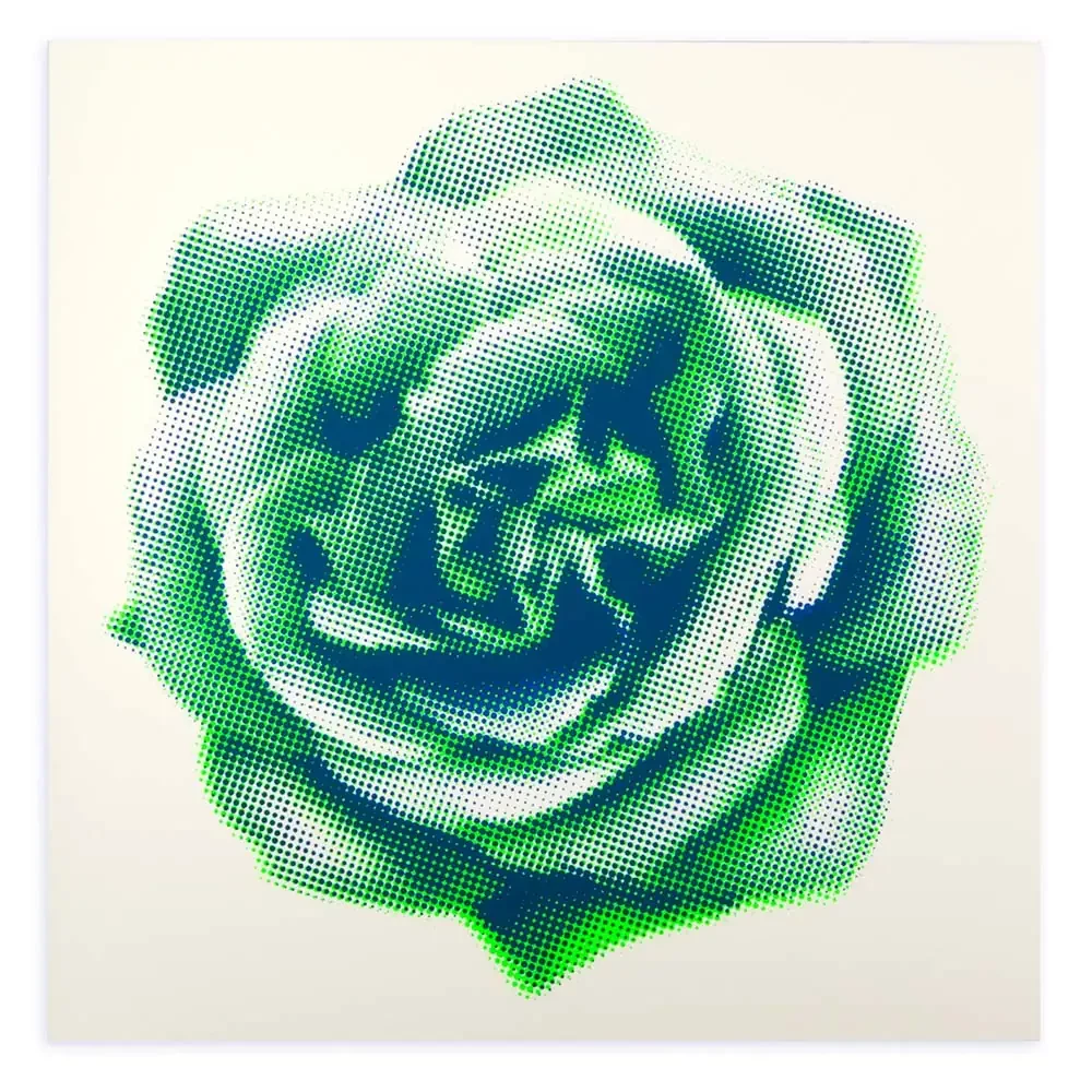 Gerasterte Rose in blaugrüner Farbgebung als Grußkarte zu Geburtstagen, Hochzeiten und weiteren Anlässen. Von Hand bedruckt im Siebdruck, Material Opal ecru. Format der Karte ist 158x158 mm. Passender Umschlag mit Seidenfutter.