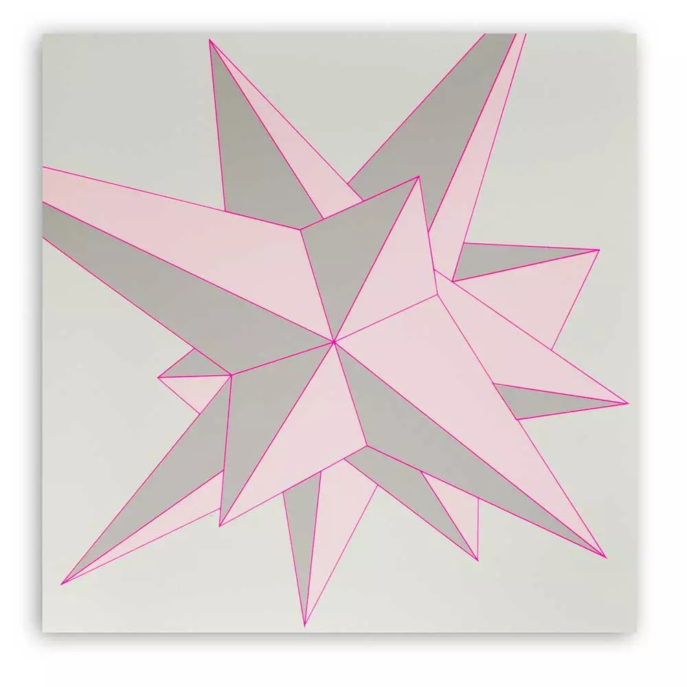 Die graphische Klappkarte mit Stern stammt direkt aus dem Gestaltungs- und Siebdruckatelier von Bethge. Gedruckt wird die Grußkarte dreifarbig auf grauem Karton. Die linearen Umrisse des Sterns leuchten dabei in Neonpink, Schattierungen sind in dunklem Grau und mattem Rosa gehalten. Jede Farbe wird im Siebdruck manuell aufgetragen und benötigt eine gewisse Trocknungszeit, damit das Farbbild brillant und satt ist. Jeder Grußkarte liegt ein weißes Kuvert bei.