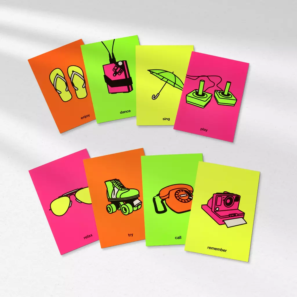 Dieses Kartenset umfasst acht im Siebdruck von Hand gefertigte Designkarten in intensiven Neonfarben. Die Motive von Hubertus von Alvensleben greifen den Kultsong „Everybody's Free (To Wear Sunscreen)“ auf und übersetzen ihn in moderne, typografische Bildbotschaften über Leben, Glück und Achtsamkeit.