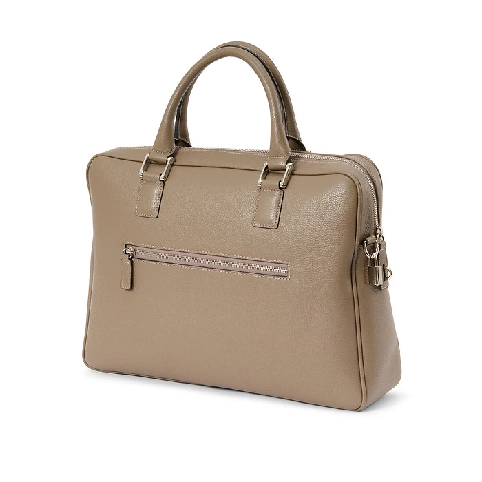 Das feine italienische Rindsleder ist gleichmäßig leicht strukturiert, außerordentlich robust und entwickelt mit dem Gebrauch eine charaktervolle Patina. Jedes Stück wird in traditioneller Handarbeit in einer italienischen Manufaktur gefertigt. Das Innenfutter aus weichem Velours schützt Laptop, Notizbuch und Unterlagen zuverlässig vor Kratzern. Ein Reißverschlussfach sowie vier Einschubfächer mit Druckknopf-Verschluss schaffen Ordnung ohne Aufwand. Die Kanten des Leders werden von Hand versiegelt. Verchromte Metallteile setzen präzise Akzente.