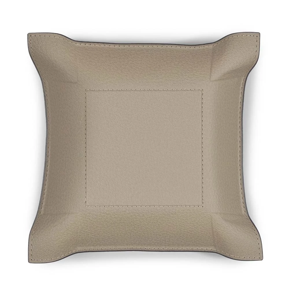 Dieser hochwertige Taschenleerer aus geprägtem Kalbsleder in Wildschwein-Optik dient als zeitlose und stilvolle Ablagefläche für Schlüssel, Schmuck, Accessoires oder andere Kleinigkeiten. Ganz gemäß dem Vorbild einer Vide-Poche (Französisch: „leere Tasche“), einem in stilvollen Haushalten von Paris bis Berlin etablierten Interieur-Accessoire, bewahrt er den Tascheninhalt auf, bis dieser wieder zum Einsatz kommt. Die Lederablage wird nach unseren Vorgaben und in traditioneller Handarbeit in einer kleinen Manufaktur für Lederwaren in Italien gefertigt – mit handwerklichem Geschick und dem Sinn für das beste Material. Der Rand des Accessoiretrays kann dank einer in das Leder eingearbeiteten, dünnen Bleiplatte nach Belieben aufgestellt, formschön drapiert oder flach ausgebreitet werden. Für einen besonderen Kontrast sorgen die farblich abgesetzten Kanten. Das Format beträgt im flachen Zustand 20,0 x 20,0 cm, der stabile Boden im Inneren hat ein Format von 10,0 x 10,0 cm.
