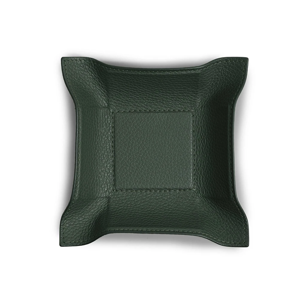 Dieser hochwertige Taschenleerer aus geprägtem Kalbsleder mit Hirsch-Optik dient als zeitlose und stilvolle Ablagefläche für Schlüssel, Schmuck, Accessoires oder andere Kleinigkeiten. Ganz gemäß dem Vorbild einer Vide-Poche (Französisch: „leere Tasche“), einem in stilvollen Haushalten von Paris bis Berlin etablierten Interior-Accessoire, bewahrt er den Tascheninhalt auf, bis dieser wieder zum Einsatz kommt. Die Lederablage wird nach unseren Vorgaben und in traditioneller Handarbeit in einer kleinen Manufaktur für Lederwaren in Italien gefertigt – mit handwerklichem Geschick und dem Sinn für das beste Material. Der Rand des Accessoiretrays kann dank einer in das Leder eingearbeiteten, dünnen Bleiplatte nach Belieben aufgestellt, formschön drapiert oder flach ausgebreitet werden. Für einen besonderen Kontrast sorgen die farblich abgesetzten Kanten. Das Format beträgt im flachen Zustand 15,0 x 15,0 cm, der stabile Boden im Inneren hat ein Format von 6,0 x 6,0 cm.