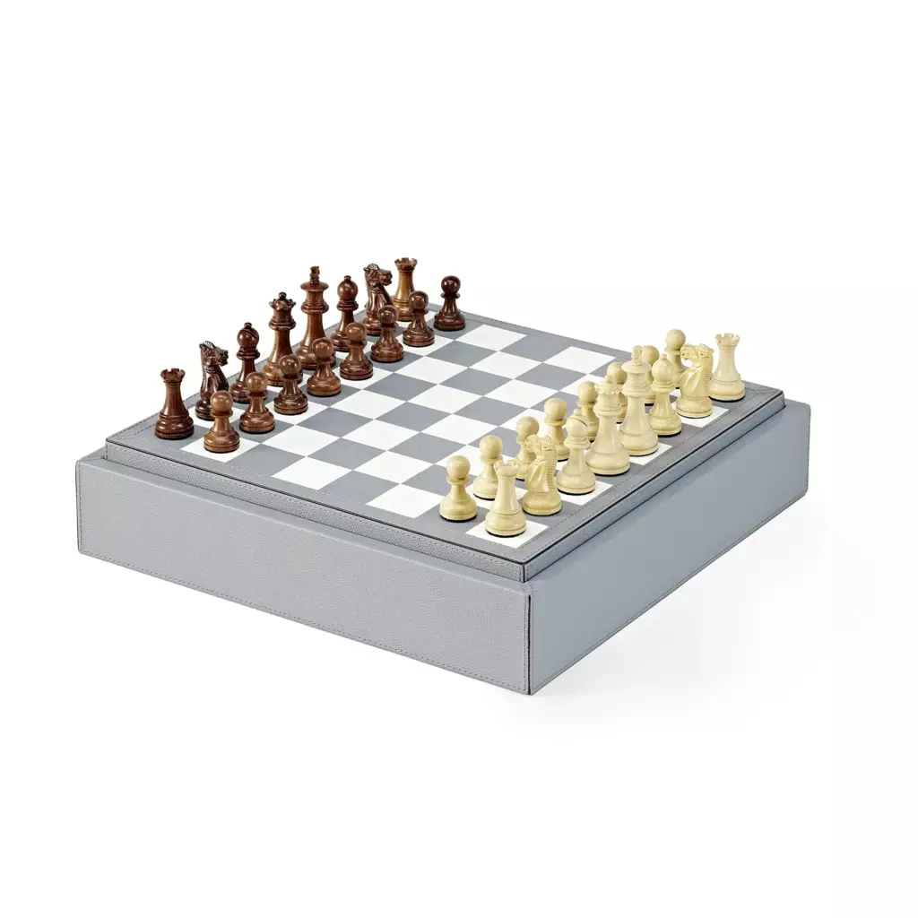 Spielesammlung (Mühle, Dame, Schach, Domino), Leder Grau