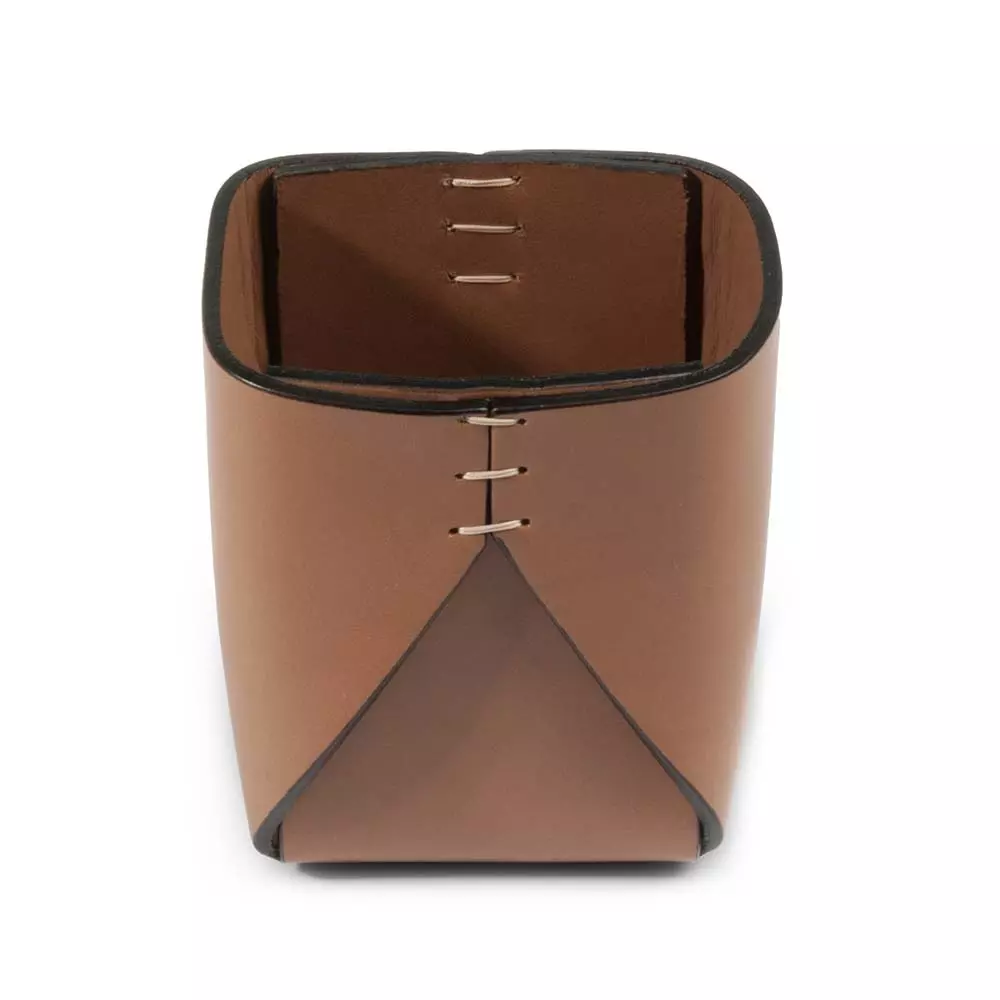 Dieser formschöne Stiftebecher für Schreibgeräte und Schreibtischutensilien wird aus einem einzigen Stück zweilagigem Rindvollleder in italienischer Manufaktur-Handarbeit gefertigt. Das Leder wird mit einigen präzisen Schnitten versehen, von Hand gefaltet und sorgfältig zusammengenäht. Diese raffinierte Fertigungstechnik sorgt für ein minimalistisches Design, welches nahezu komplett ohne störende Nähte, z. B. im Boden, auskommt. Die weißen Nähte an beiden Enden, die der Kollektion Ihren Namen verleihen, setzen einen besonderen optischen Akzent. Ob auf dem Schreibtisch Zuhause oder im Büro, dank der klaren Formsprache lässt sich der Leder-Stiftebecher problemlos in nahezu jedes Interior Design integrieren. Die zweilagige Konstruktion ermöglicht die Verwendung verschiedenfarbiger Leder für die Innen- und Außenseite, wodurch ein einzigartiger Kontrast entsteht. Das Leder wird ausschließlich pflanzlich in Italien gegerbt. Für eine stimmige Inneneinrichtung empfiehlt sich eine Kombination mit Stiftablage, Ablagekasten, Schreibtischunterlage oder Mousepad derselben Machart.