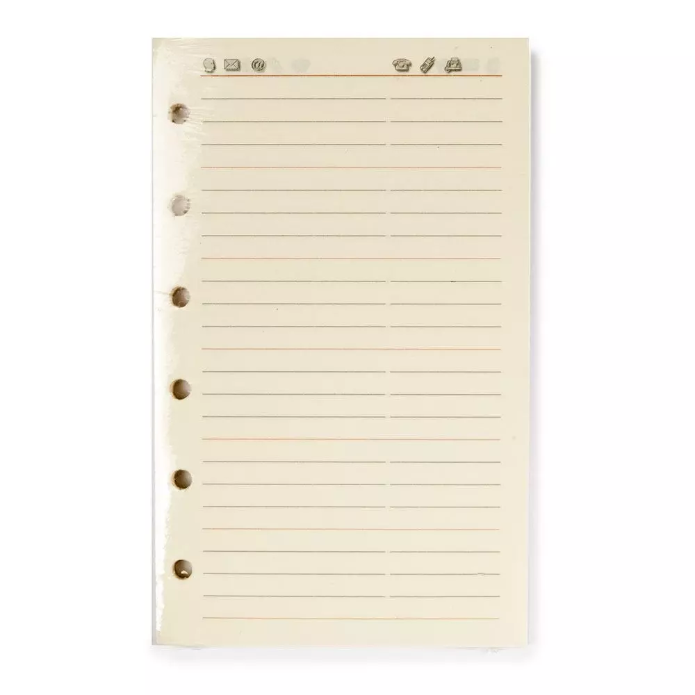 Da sich Kontakte und Adressen ständig ändern, wird es im Laufe der Zeit vorkommen, dass der Pocket Planer von Bethge eine Generalüberholung benötigt. Um Adress- und Telefonverzeichnis wieder auf den neuesten Stand zu bringen, wird das Refill mit passender Sechsfach-Ringung verwendet. Hier können Namen, Post- und E-Mail-Adressen sowie Festnetz-, Handy- und Faxnummern eingetragen werden. Da die Einlage kein alphabetisches Register besitzt, können die Blätter dort einsortiert werden, wo sie benötigt werden. Das Refill ist im Creme-Farbton gehalten und hat das Format 7,7 x 12,7 cm.