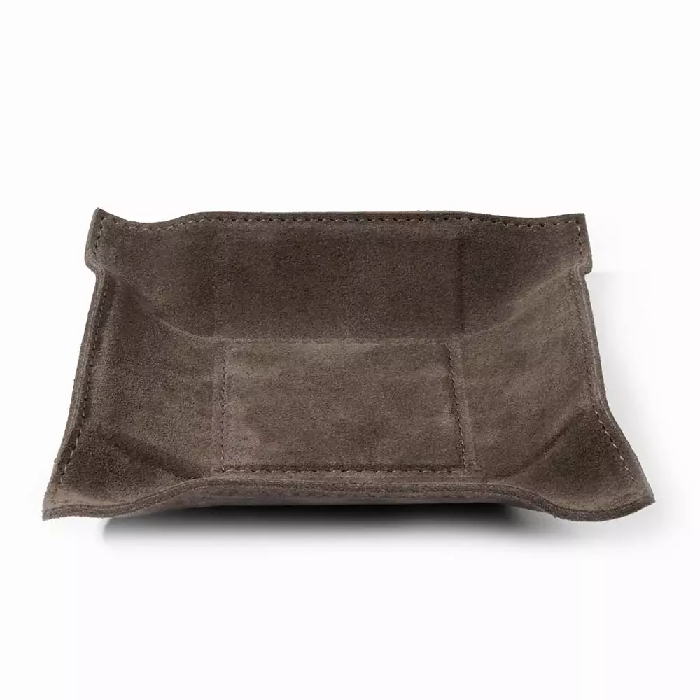 Dieser hochwertige Taschenleerer aus Veloursleder dient als zeitlose und stilvolle Ablagefläche für Schlüssel, Schmuck, Accessoires oder andere Kleinigkeiten. Ganz gemäß dem Vorbild einer Vide-Poche (Französisch: „leere Tasche“), einem in stilvollen Haushalten von Paris bis Berlin etablierten Interieur-Accessoire, bewahrt er den Tascheninhalt auf, bis dieser wieder zum Einsatz kommt. Die Lederablage wird nach unseren Vorgaben und in traditioneller Handarbeit in einer kleinen Manufaktur für Lederwaren in Italien gefertigt – mit handwerklichem Geschick und dem Sinn für das beste Material. Der Rand des Accessoiretrays kann dank einer in das Leder eingearbeiteten, dünnen Bleiplatte nach Belieben aufgestellt, formschön drapiert oder flach ausgebreitet werden. Das Format beträgt im flachen Zustand 15,0 x 15,0 cm, der stabile Boden im Inneren hat ein Format von 6,0 x 6,0 cm.
