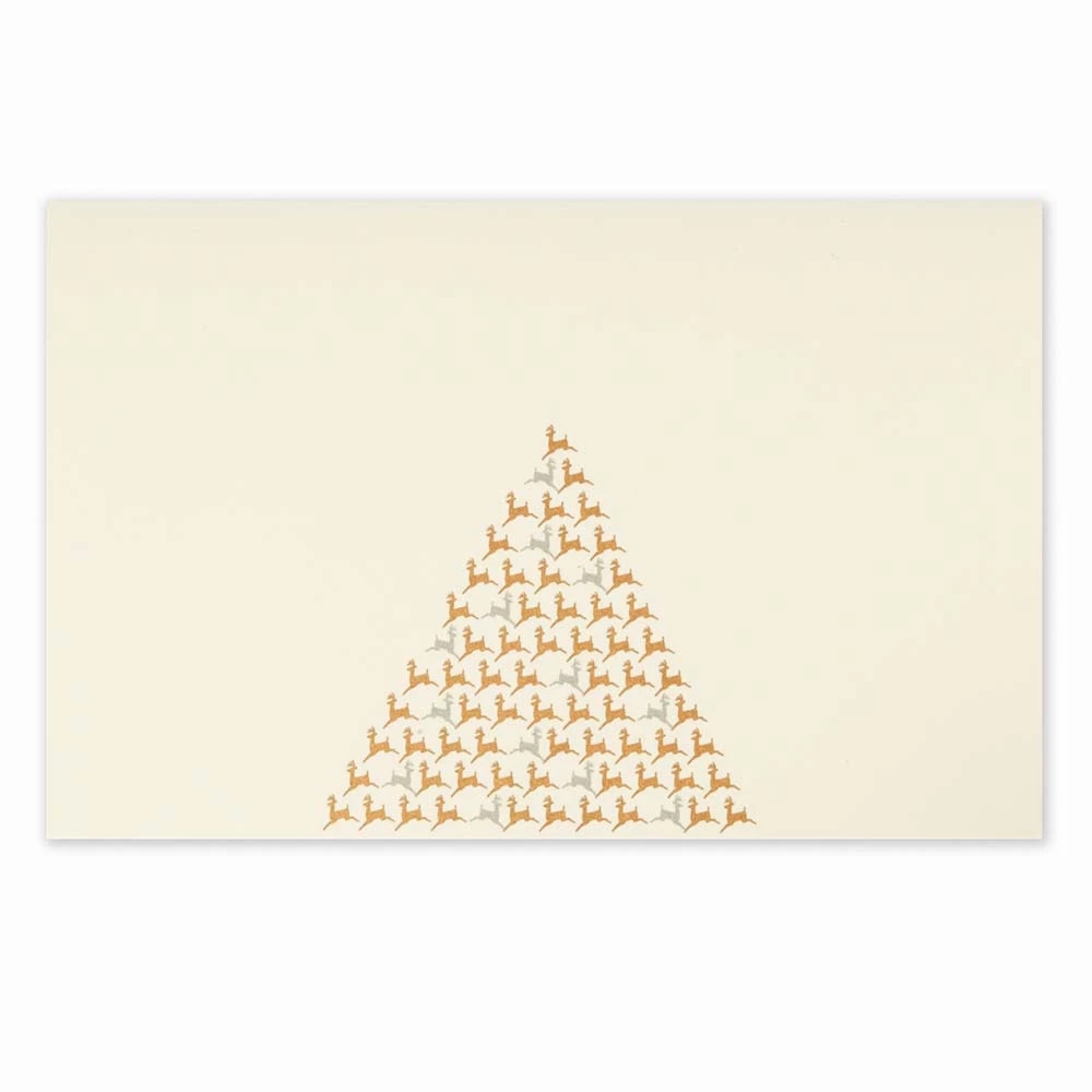 Ein Baum oder kleine Hirsche? Elegante Weihnachtsklappkarte übersäht mit kleinen Hirschen in Gold und Silber - raffiniert angeordnet in Form eines Baumes. Herstellt im Handsiebdruckverfahren, Umschlag mit weißem Seidenfutter.