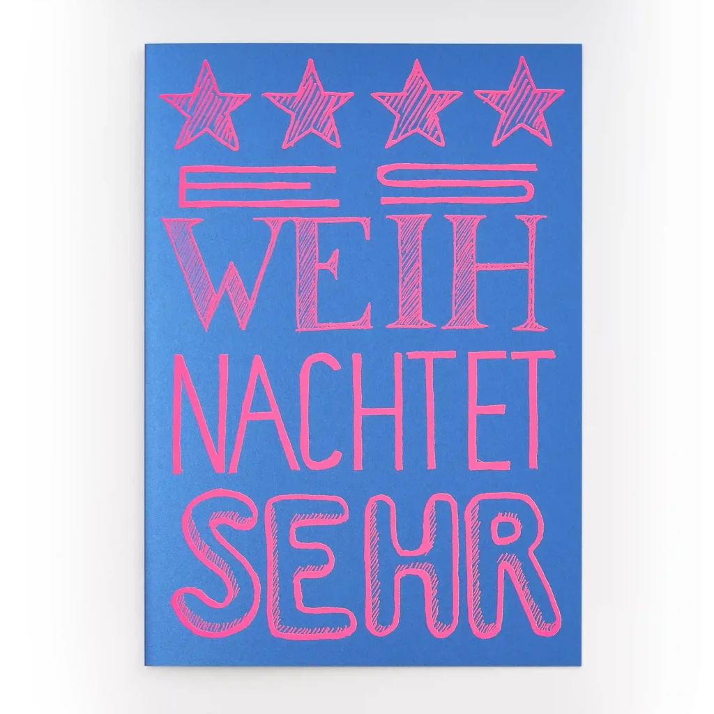 Knallige Weihnachtskarte mit Siebdruck in leuchtendem Neonpink auf einzigartig glänzendem blauem Metallic-Karton. Designt von unserem Geschäftsführer Axel Stürken.