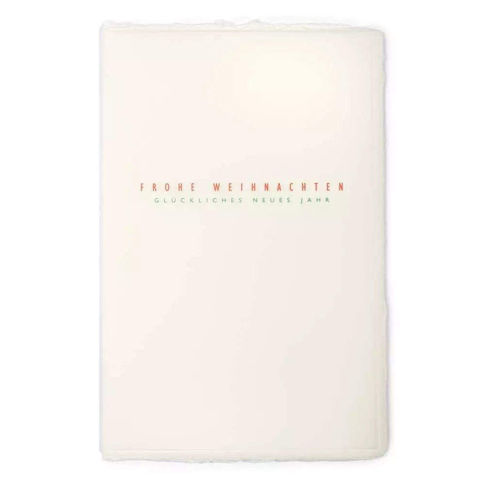 Farben der Weihnachtszeit. Klappkarte aus handgeschöpftem Bütten mit transparentem Umleger: "Frohe Weihnachten - Glückliches Neues Jahr". Umschlag B6 aus Büttenpapier, ohne Futter.