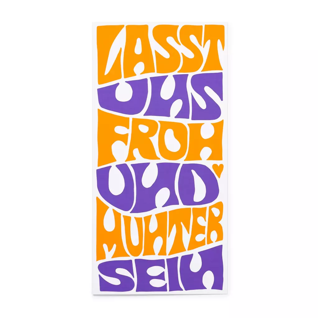 Der farbenfrohe Schriftzug „Lasst uns froh und munter sein“ ist in kräftigen Orange- und Lilatönen gestaltet und sorgt sofort für gute Laune.