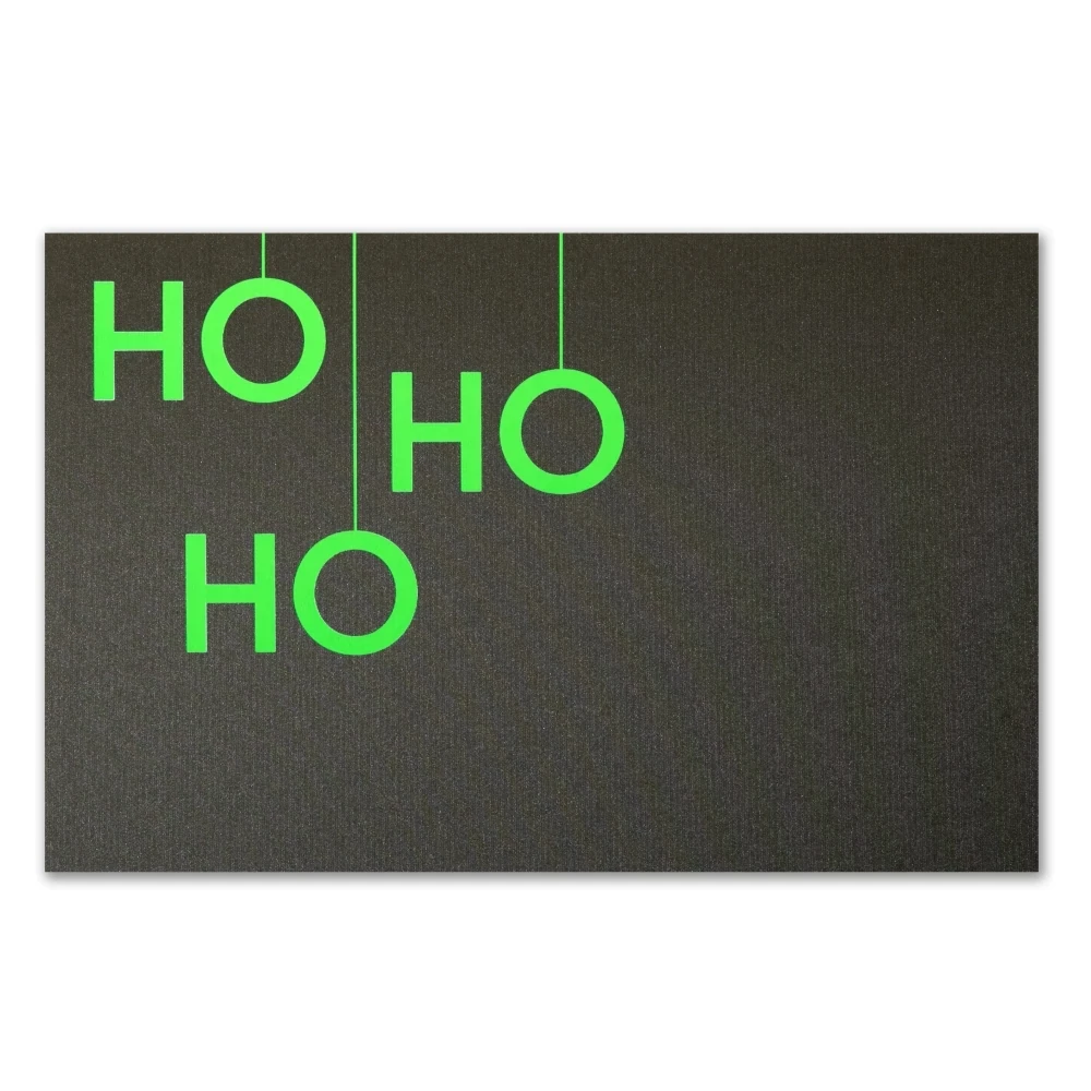 Verbreiten Sie Weihnachtsstimmung! Diese einzigartige Weihnachtskarte aus olivgrün schimmerndem Material glitzert bei Lichteinfall besonders stimmungsvoll. In unserer Siebdruck-Manufaktur von Hand bedruckt, steht das leuchtend neongrüne „Ho Ho Ho" in besonderem Kontrast.