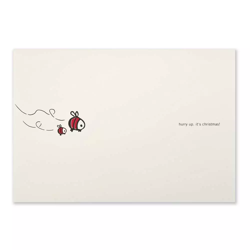 "Hurry up, it's christmas!" lautet die Botschaft, der unsere charmant illustrierte Hummel-Mutti mit ihrer Kleinen, im Rahmen ihrer beschränkten Fähigkeiten, nachzukommen versucht.