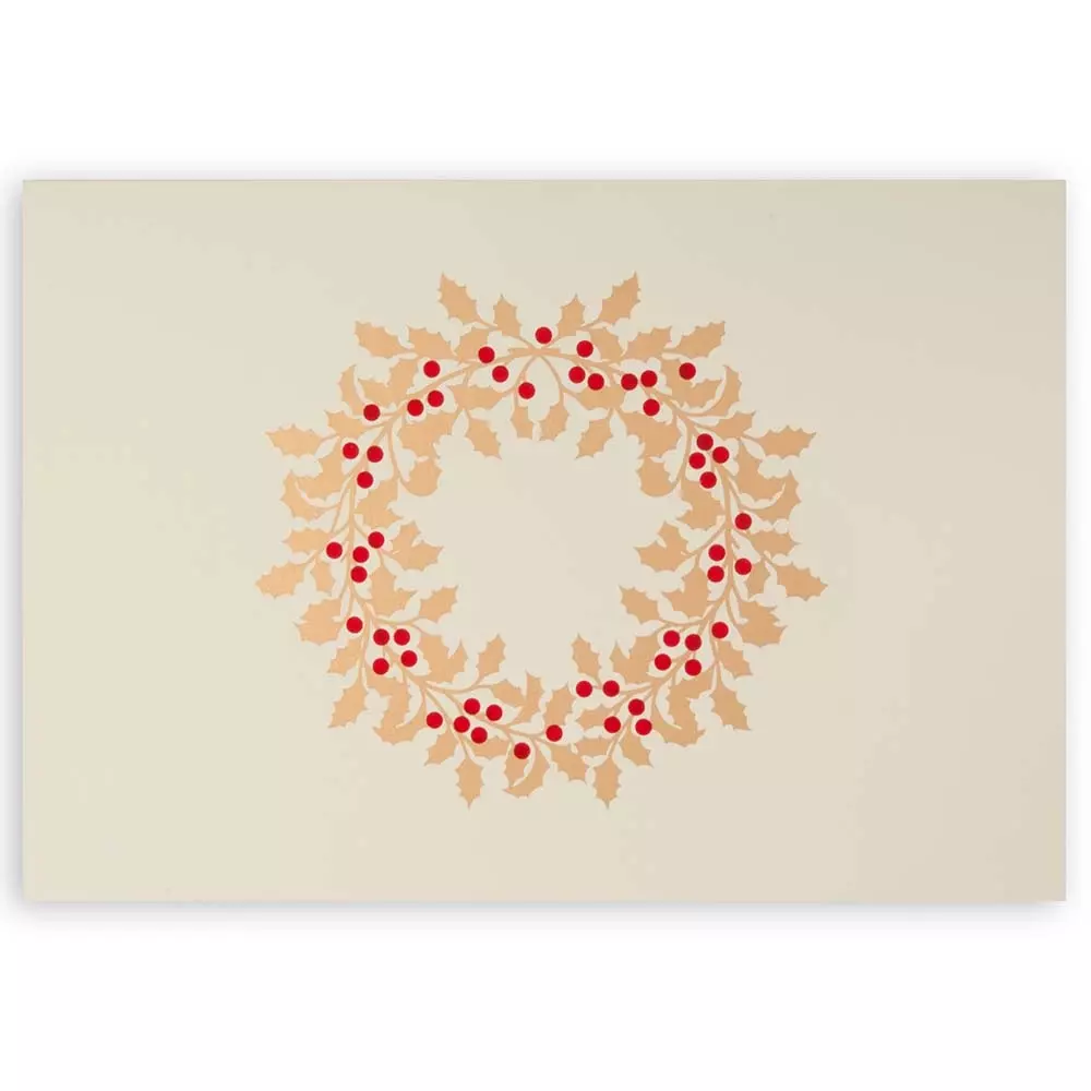 Unser beliebter Ilex-Kranz in festlichem Gold-Rot auf Pure sand von hand gedruckt. Mit dunkelrot gefüttertem Umschlag.