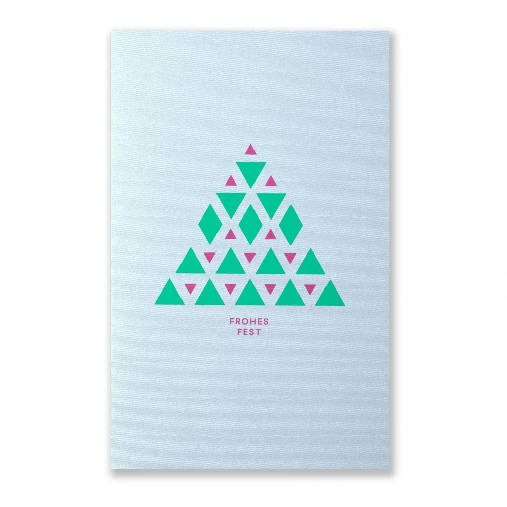 Diese Weihnachtskarte ist der perfekte Träger für Ihren persönlichen Gruß an einen besonderen Menschen. Der stilisierte Weihnachtsbaum aus verschiedenfarbigen Drei- und Vierecken in Grün und Pink übermittelt als moderne Interpretation die Botschaft: „Frohes Fest"!