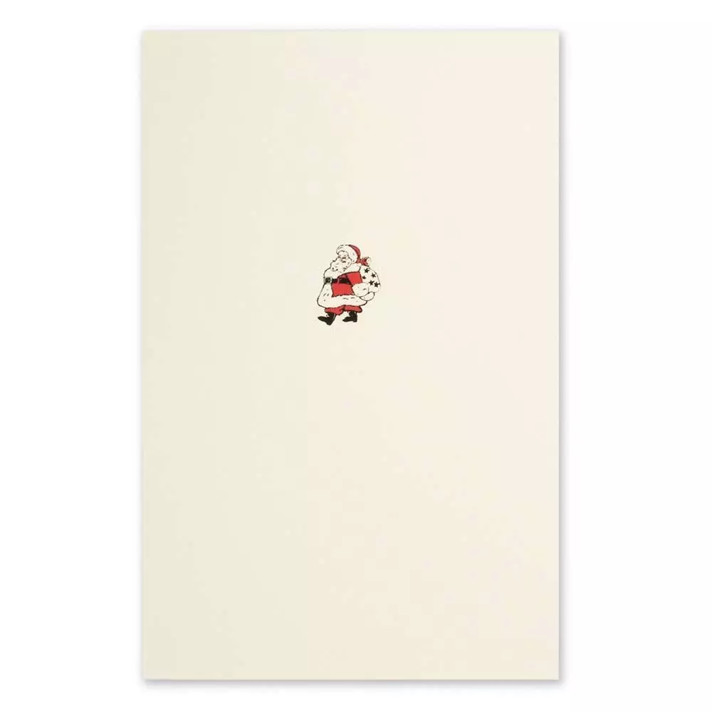 Kleiner Santa zum großen Fest. Stilvolle Klappkarte mit dezentem Weihnachtsmotiv, hergestellt im Handsiebdruckverfahren. Umschlag mit rotem Seidenfutter.