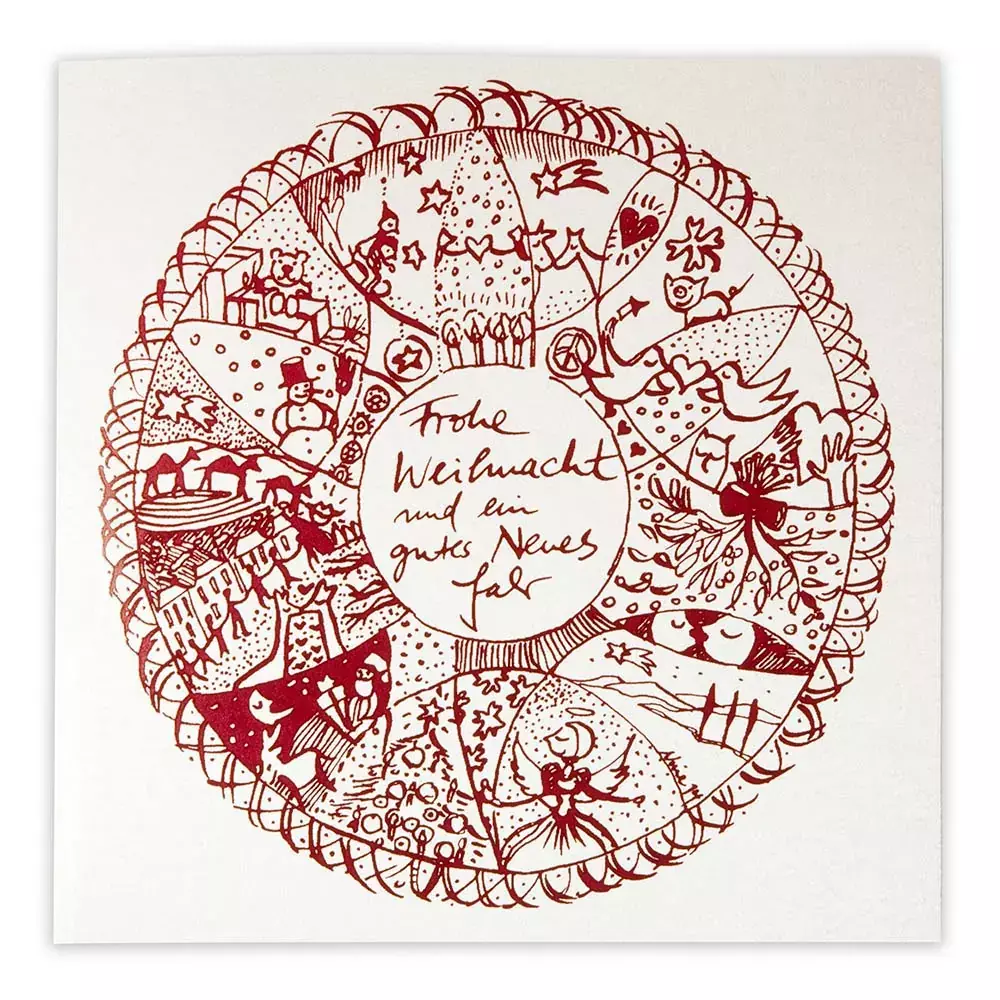Das Weihnachtsmandala wird in Handarbeit mit dunkelrotem Lack auf die 21x21 cm große Karte gedruckt und kommt damit besonders gut zur Geltung. Das Kartenmaterial besitzt einen leichten Metallic-Effekt.
