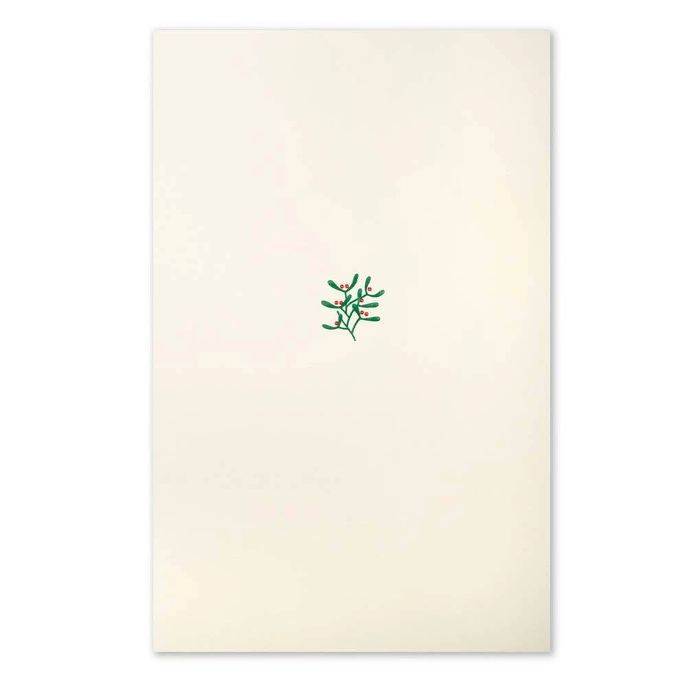 Kussbereit? Mistelzweig in grün mit roten Beerchen auf cremefarbener Klappkarte. Im zweifarbigen Stahlstichverfahren hergestellt, mit passendem Umschlag in Creme mit weißem Seidenfutter.