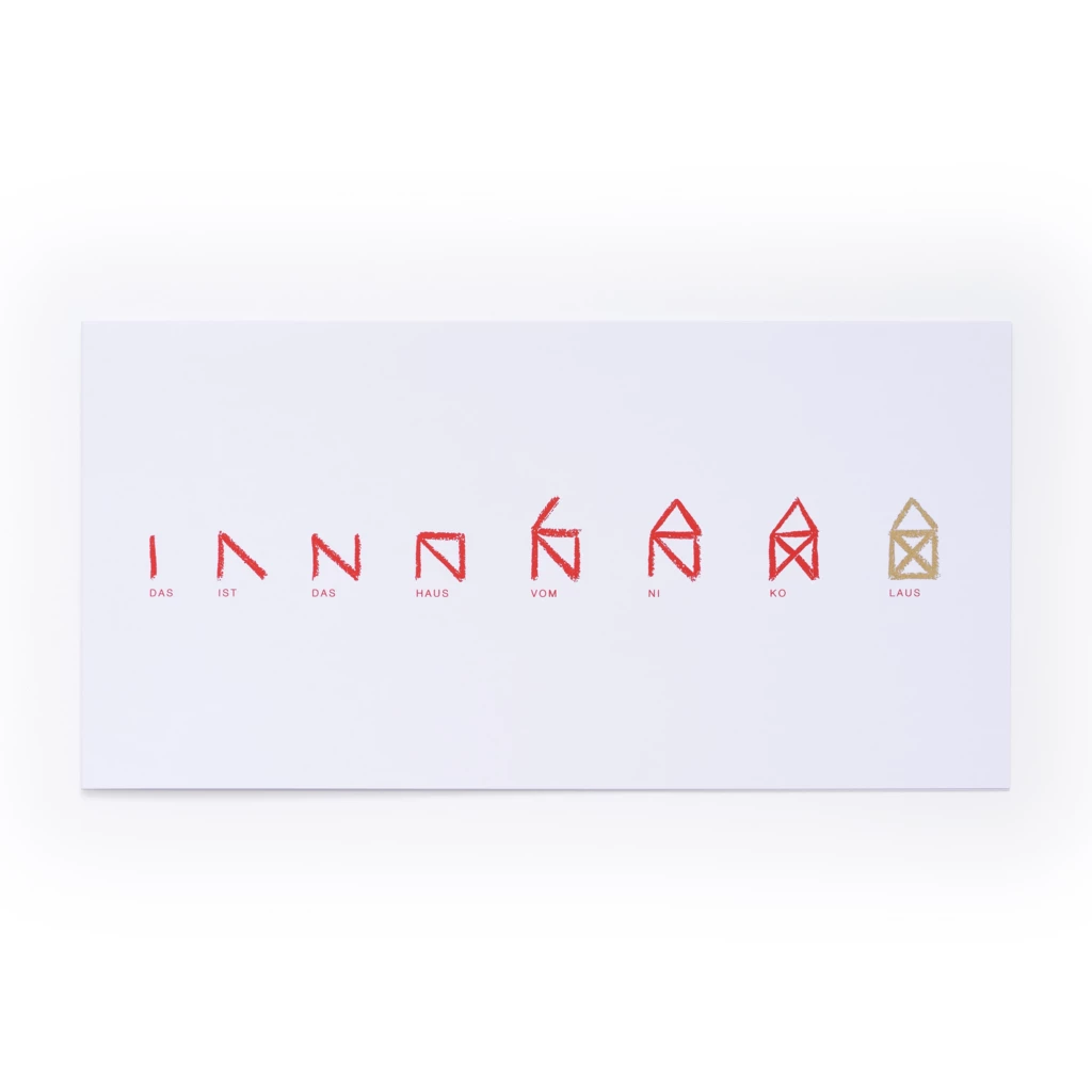 Das ist das Haus… vom Nikolaus. Witzige Weihnachtskarte handbedruckt im breiten Klappformat. Weißer Umschlag aus Smooth White mit rotem Seidenfutter.