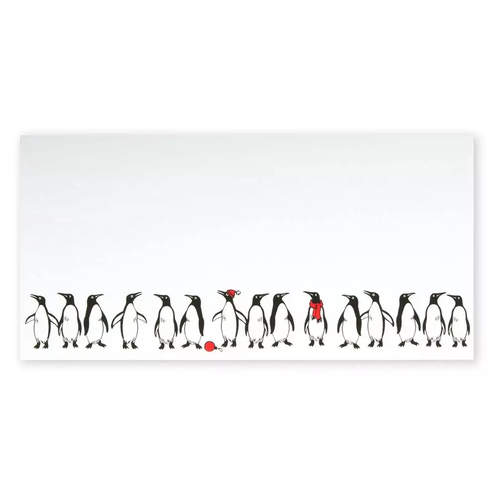 Pinguin-Eleganz. Charmantes Tiermotiv zu Weihnachten handgedruckt im Siebdruckverfahren. Klappkarte mit passendem Umschlag, rot gefüttert.