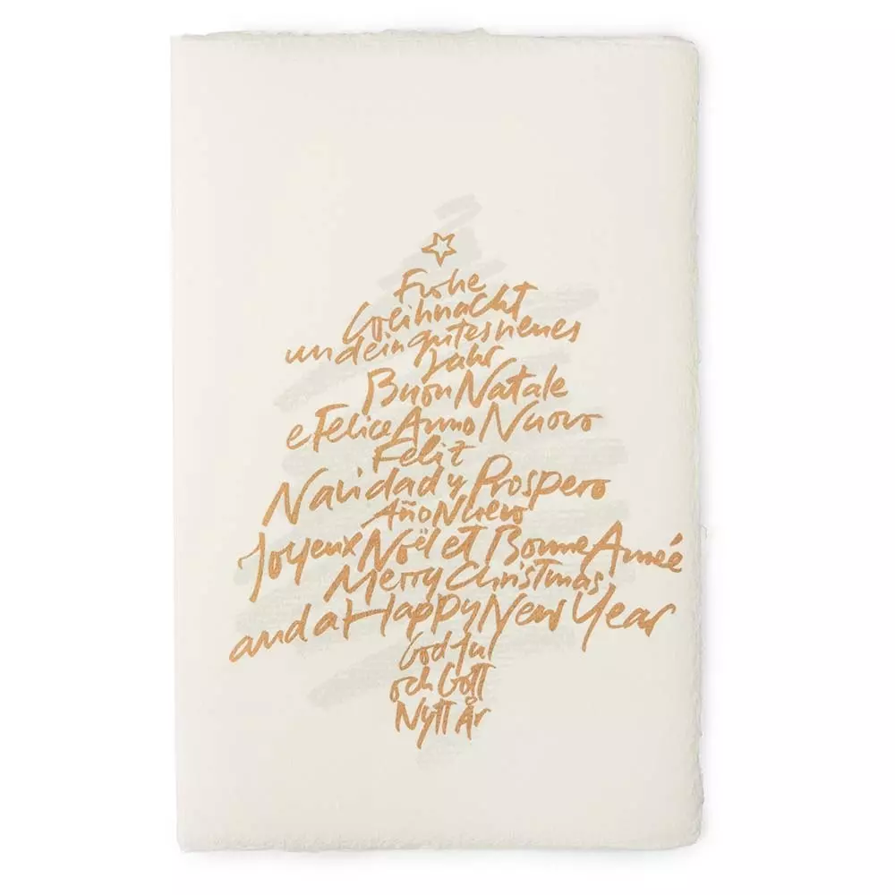 Kreativ-Baum mit internationalen Grüßen. Handbedruckte Weihnachts- und Neujahrs-Klappkarte aus echtem Bütten. Umschlag aus Büttenpapier, ohne Futter.