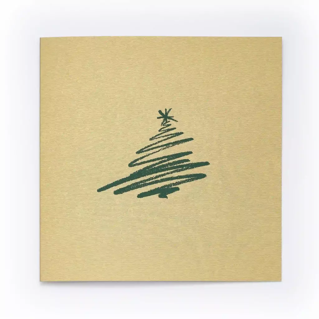 In liebevoller Handarbeit hergestellte Weihnachtskarte mit grünem Tannenbaum auf goldenem Hintergrund. Je nach Lichteinfall schimmert die Karte unterschiedlich.