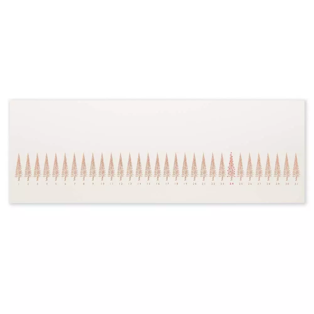 31 Bäumchen, 1 Weihnachtsbaum. Für jeden Tag im Dezember steht ein Baum in edlem Bronze, wobei der 24. Baum besonders geschmückt ist. Die exklusive Klappkarte wird von Hand bedruckt. Umschlag mit Sattelklappe, ohne Futter.
